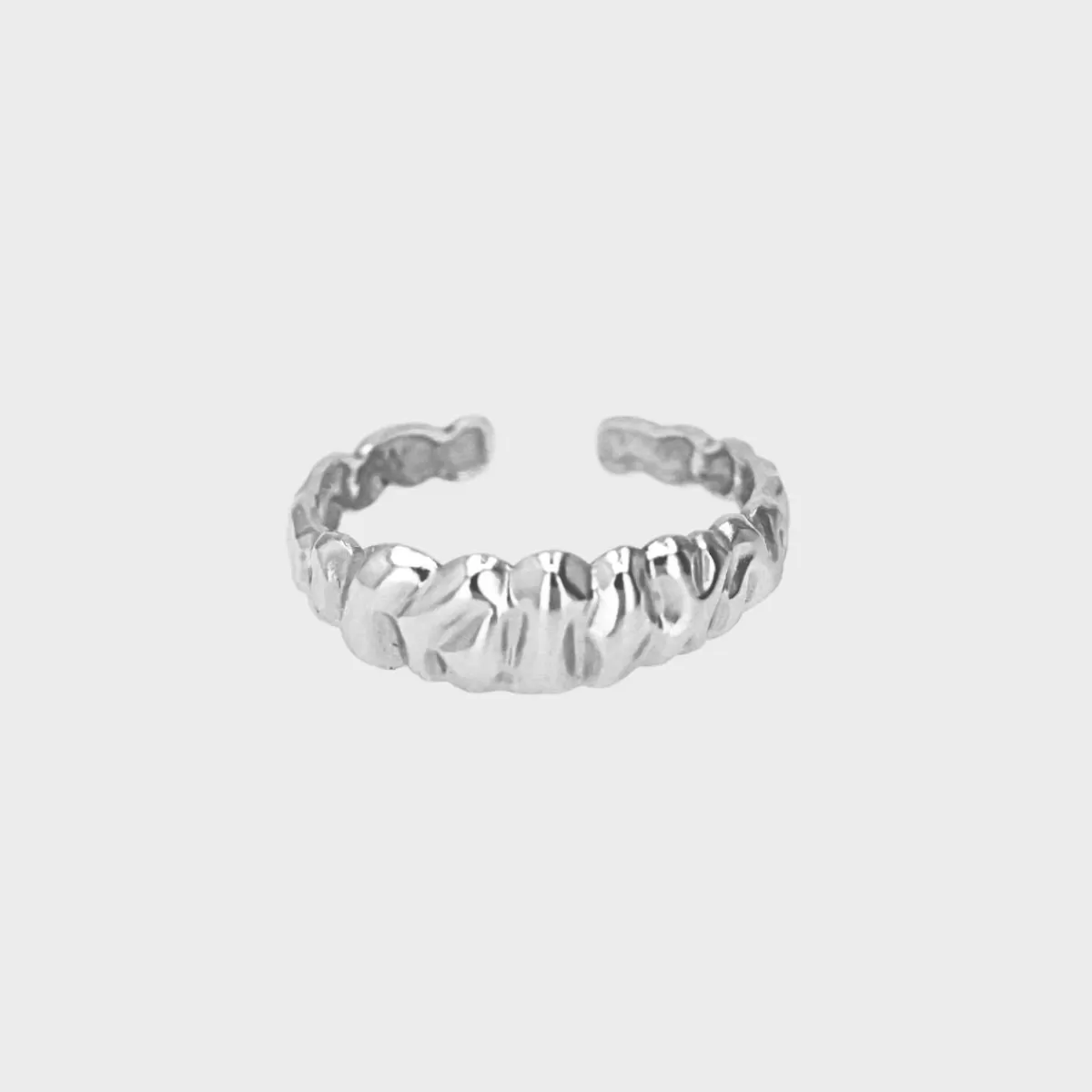 Vores chunky ring med kant er et smykke, der er med til at udfordre det perfekte. Bredden på ringen og det upolerede ydre gør ringen til et statement smykke. Den har tilfældige former og kanter som giver noget kant og råt til udtrykket. Den cool ring kan fås i både sølv- og guldbelagt sølv. Den chunky ring har tekstur i materialet, hvilket giver fingerringen noget kant og unikt udseende. Du kan selv justere ringen, hvilket betyder du kan bruge den på alle fingre og den kan også bruges til enhver hånd.